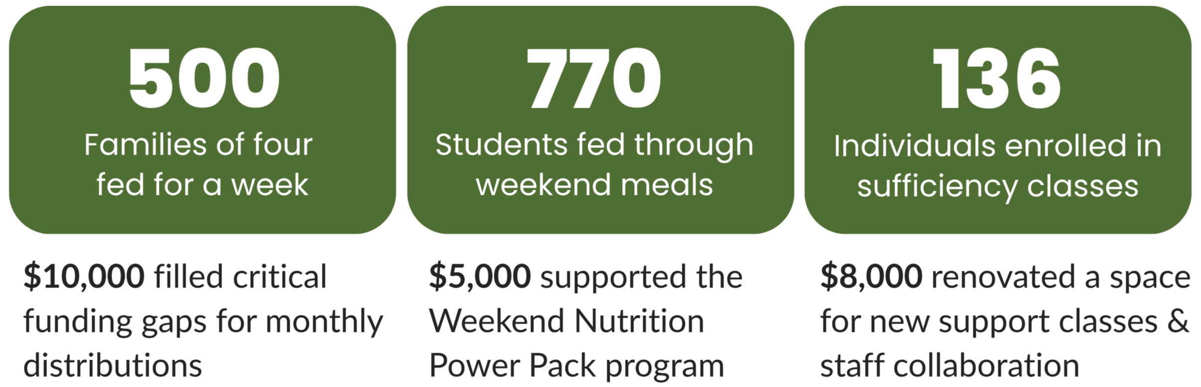 We also provided $5,000 to provide students with food over the weekends through Project SHARE’s weekend nutrition powerpack program. This supports not only the students but also provides financial relief for their parents or guardians. This grant helped cover about 1/10 of the annual cost of this program.